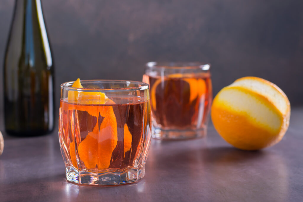カンパリはイタリア産のアマロ(薬草系のリキュール)で、クローブやシナモンなどのスパイスと柑橘系の爽やかさや苦味が特徴的です。これにジンのしっかりとしたアルコール感とジュニパーベリーの風味が加わり、満足する一杯に仕上がります。このままでは苦味が勝ってしまいますが、そこにスイートベルモットの甘みが加わり、味に丸みが出て飲みやすくなります。