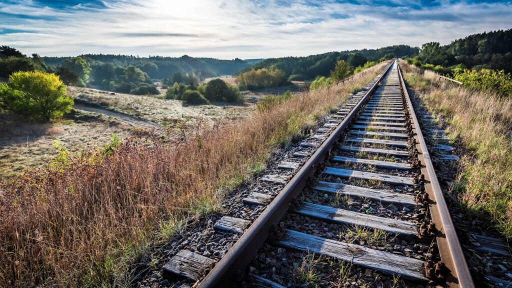 Old railway line in the frosty sunrise